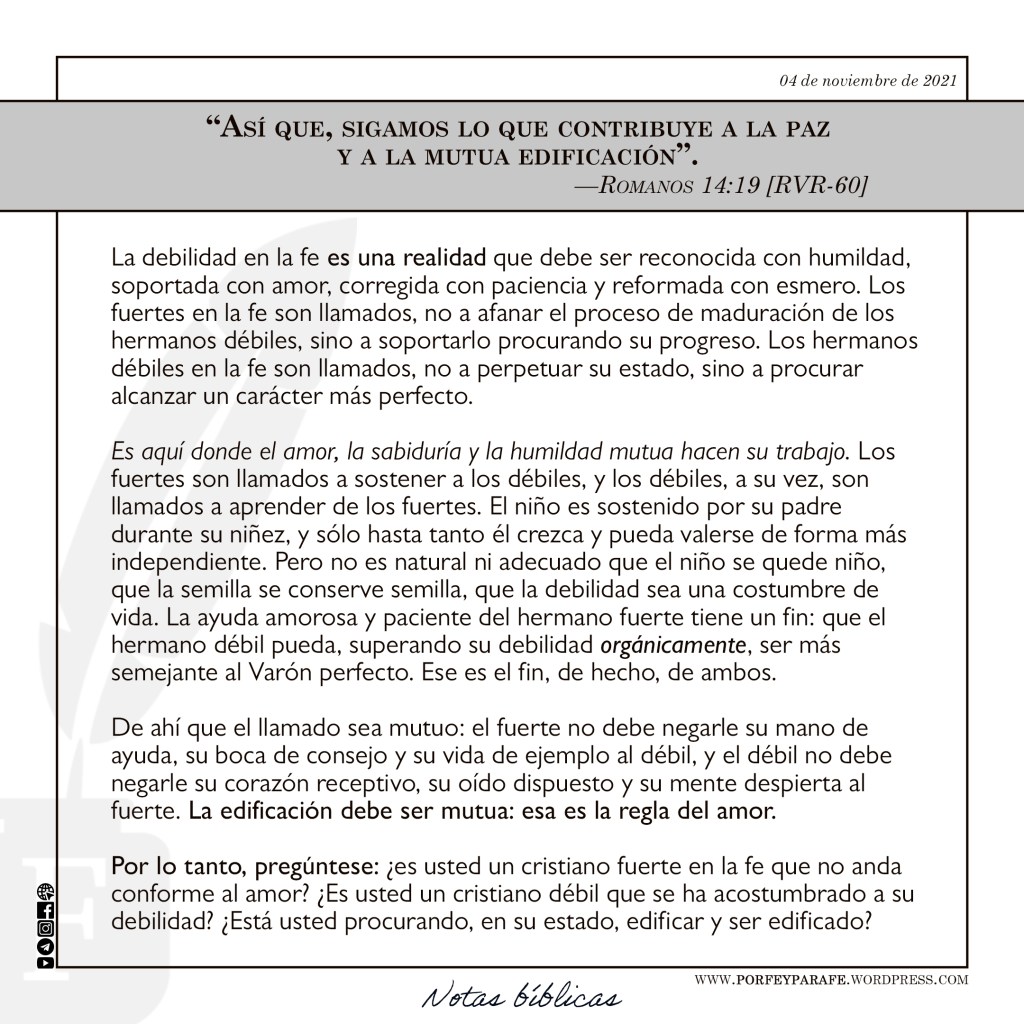 - Edificación mutua (Romanos 14:19).
